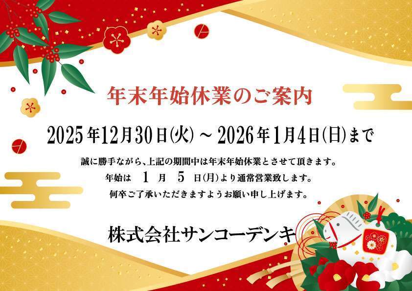 年末年始休業期間 2025年12月30日(火)~2026年1月4日(日)